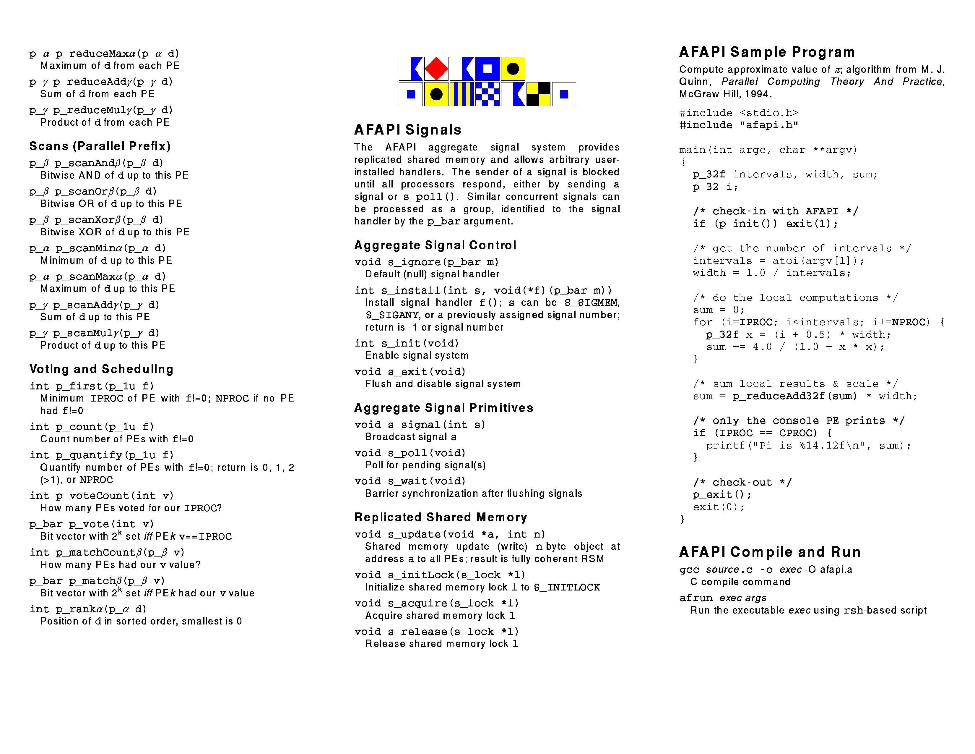 The GIF images on this page are the two sides of the CAPERS AFAPI reference card. You can print a version of the reference card by, for each of the images below, clicking on the image and then using your browser's landscape-format print option. Alternatively, you can download and print the two-page postscript version. The full CAPERS AFAPI 970530 is available as a .tgz file.