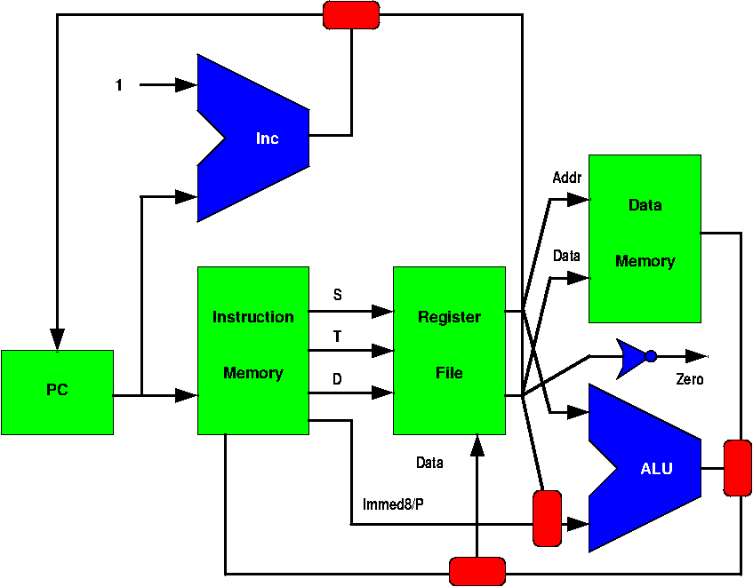 You should recognize this from my little walk-through in class the week of October 24, but I have re-drawn it much neater. It's also color coded. Registers and other memory units are green, things that compute values are blue, and multiplexors are red. I'm not going to go through everything again here, but some key ideas were: