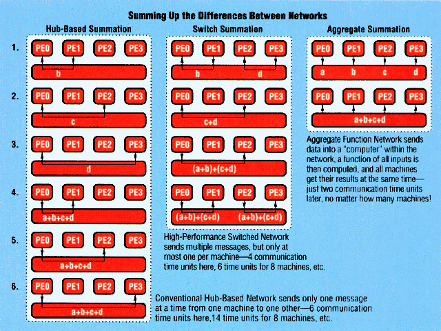 "Ethernet or other networks typically require at least hundreds of microseconds to send a simple message from one processor to another," Dietz says. Operations like barrier synchronization or aggregate functions must be accomplished using many of these slow one-to-one communications.