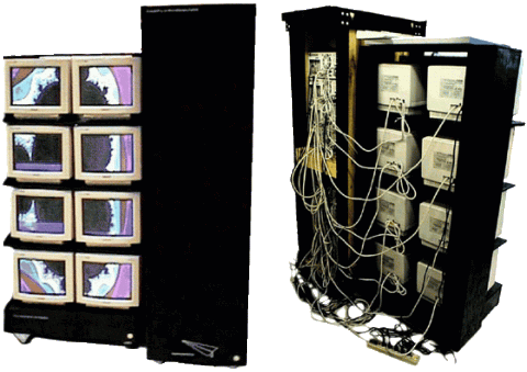 Spareparticus has eight 386DX33 systems connected by 10 Mb/s Ethernet and PAPERS networks, driving a 2x4 video wall using 14" monitors. This cluster is now used primarily for development and testing of the AFAPI-based parallel file system and some VGA-based video wall software. Front and back views of this cluster are shown above; the application running is a simple Mandelbrot fractal computed using PAPERS to dynamically balance load across processors.